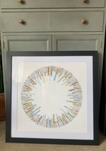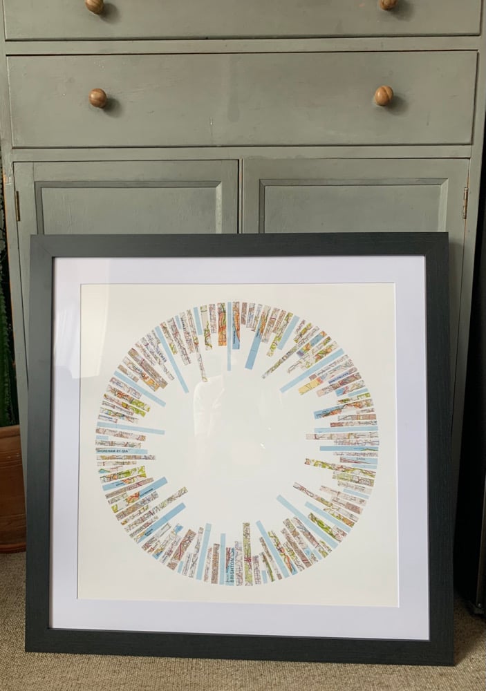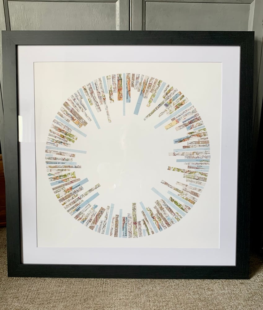 A circle of Sussex towns and villages, made from old maps. Mounted and framed 73cm x 73cm.