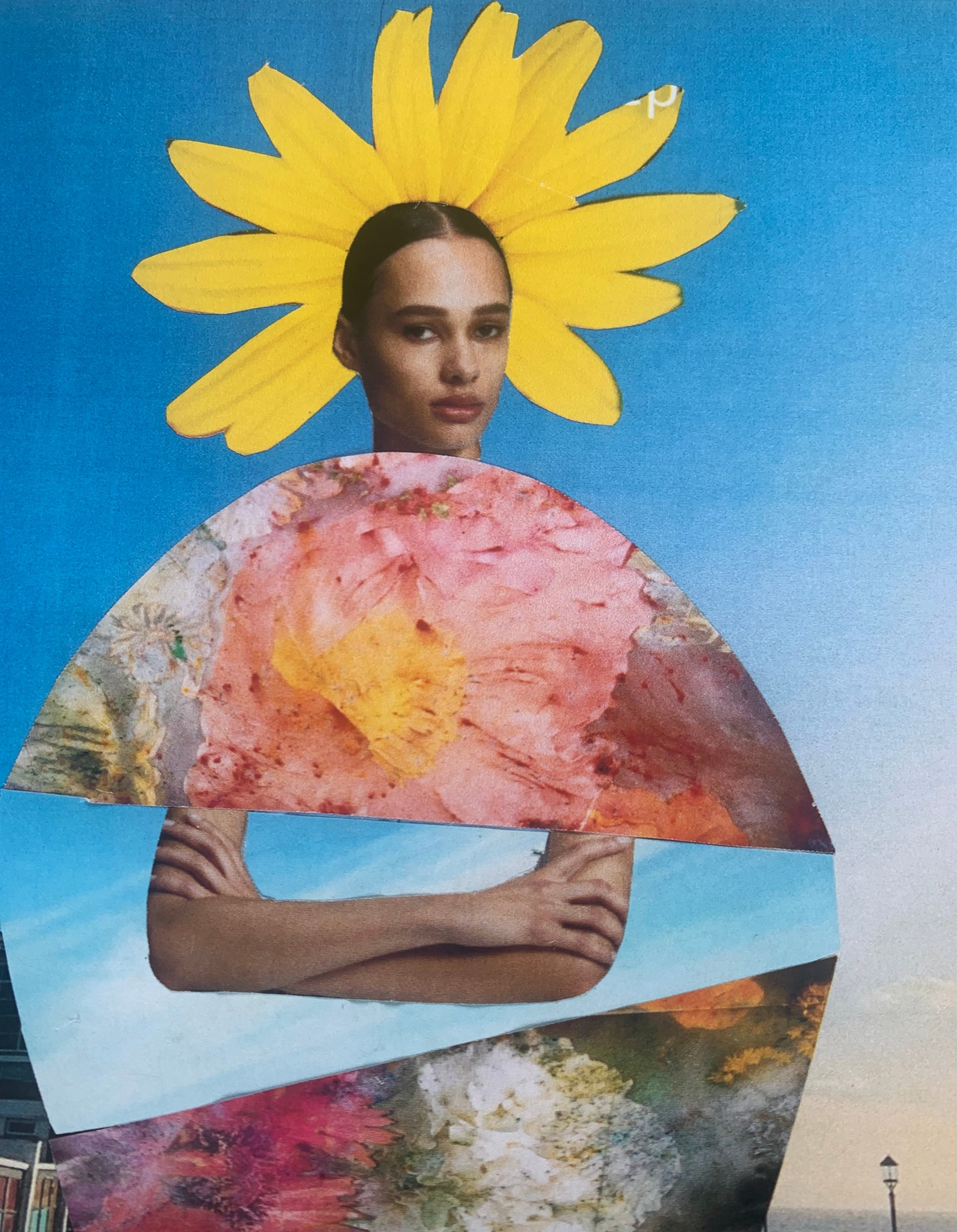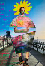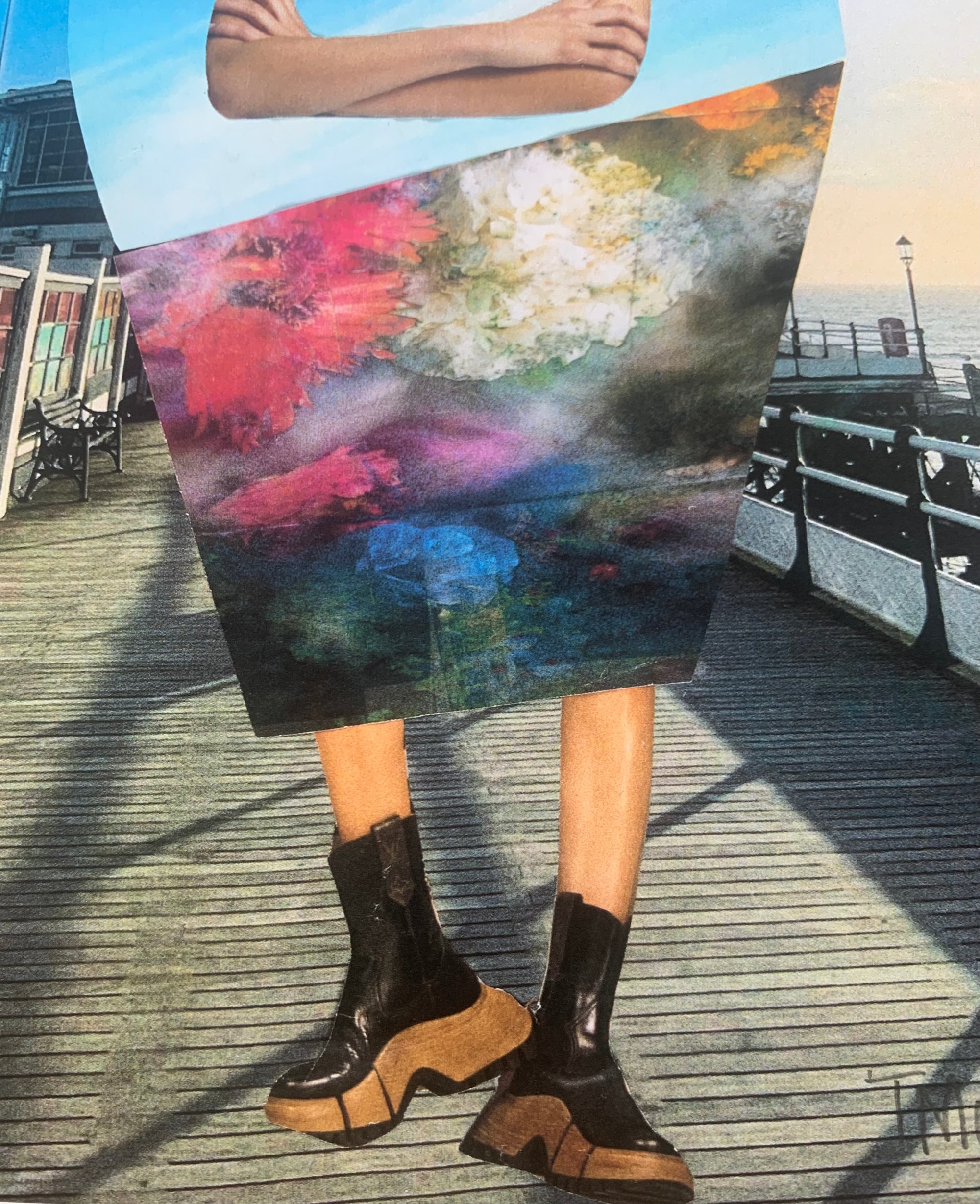 An A4 framed collage print featuring a colourful mix of images taken from magazines, The print is of a woman strolling along Worthing Pier