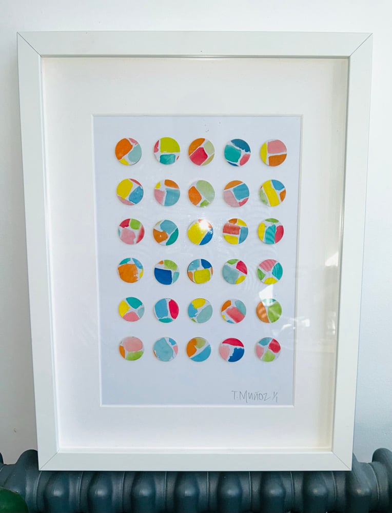 A unique piece of art made with 30 x 25mm individual water colour circles placed on wood.